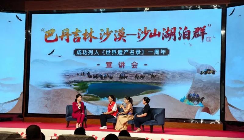 宣講會(huì)上,知名專(zhuān)家、一線(xiàn)工作者、志愿服務(wù)隊(duì)代表等宣講嘉賓和文旅從業(yè)者齊聚一堂,通過(guò)主題宣講、人物訪談的形式,共同回顧了“巴丹吉林沙漠—沙山湖泊群”申遺成功一周年以來(lái)的保護(hù)成果,立體展現(xiàn)了巴丹吉林沙漠的生態(tài)價(jià)值、保護(hù)實(shí)踐與時(shí)代意義,探討這片世界自然遺產(chǎn)的未來(lái)發(fā)展之路。