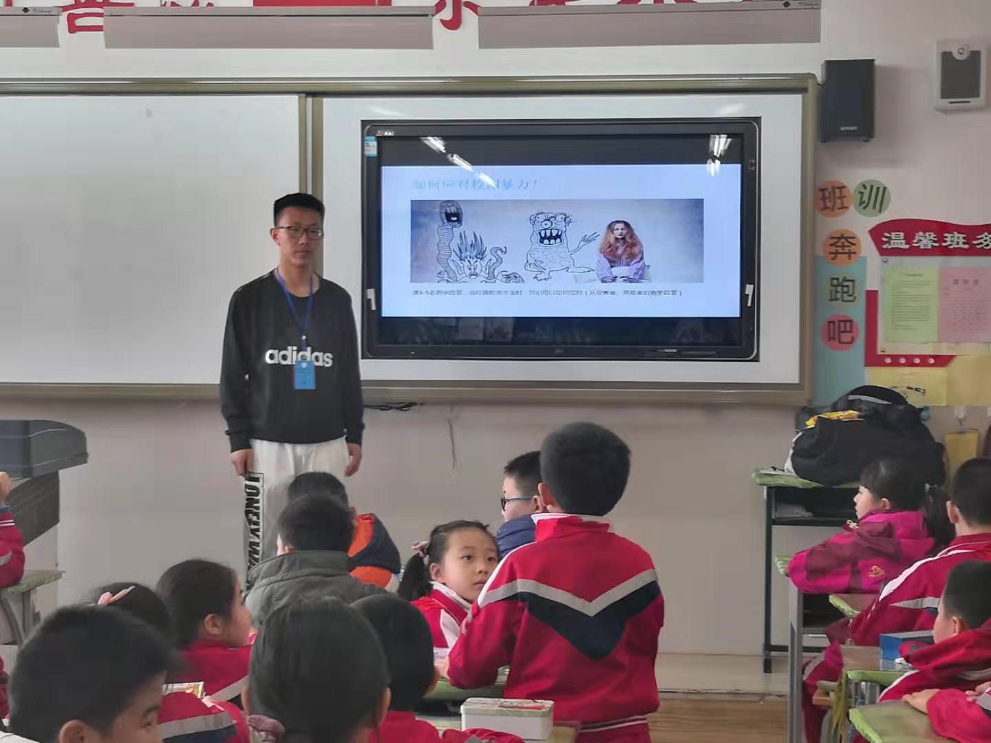 只見一個長相魁梧的“歹徒”不僅擋住同學(xué)們回家的路,還口出狂言。而路過的幾名同學(xué)正不知所措。原來這是由北垣小學(xué)的師生們正在進行校園暴力演習(xí),且當(dāng)天還邀請了52位律師走進校園,為同學(xué)們上了一堂生動的法律常識課。