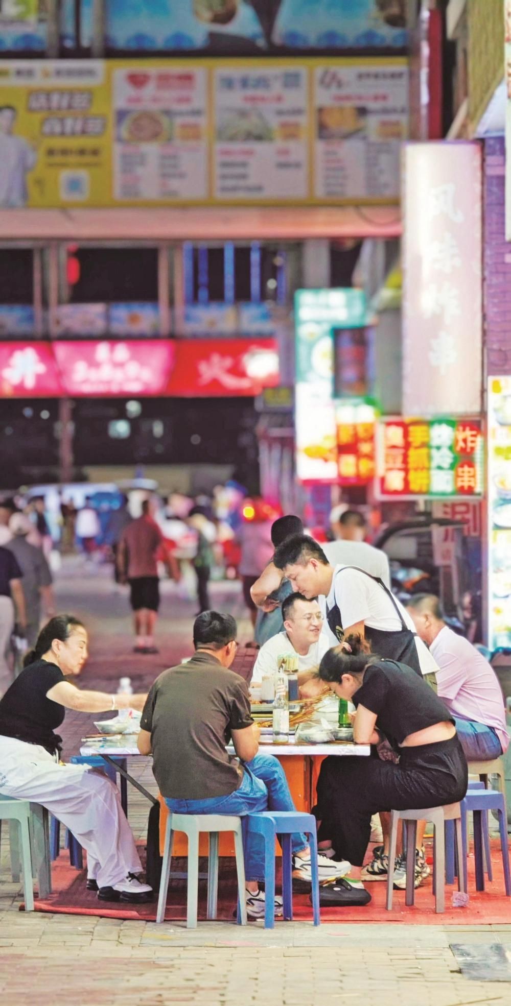 炭火上的羊肉串嗞嗞作響,油脂滴落,迸出金色火花,散發(fā)出誘人的香氣。客人圍坐在塑料小桌旁,手里拿著冰鎮(zhèn)啤酒,碰杯傳出清脆的響聲……這里沒(méi)有高檔餐廳的拘謹(jǐn),只有朋友相聚的歡樂(lè)和大口吃肉的暢快。大學(xué)生徐瑞虹放暑假后,經(jīng)常和朋友來(lái)夜市消暑。“我們幾個(gè)沒(méi)事就來(lái)萬(wàn)達(dá)金街轉(zhuǎn)一轉(zhuǎn),天太熱了,待在家里也悶,而且夜市里的這些小吃我們都比較喜歡,沒(méi)事幾個(gè)人喝幾瓶啤酒,聊一聊天,感覺(jué)還是很愜意的。”對(duì)于年輕人來(lái)說(shuō),夜市不僅是美食的聚集地,更是釋放壓力、享受生活的好去處。在這里,他們可以暫時(shí)拋開(kāi)煩惱,盡情享受美食帶來(lái)的快樂(lè)。