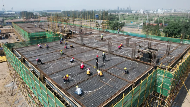 “目前,項目正在進(jìn)行基礎(chǔ)設(shè)施施工,辦公樓已完成1層封頂,1號車間正在進(jìn)行主體結(jié)構(gòu)的鋼管架的搭設(shè)和模板制作,外網(wǎng)工程和2號、3號車間基礎(chǔ)施工也在順利推進(jìn)?!表椖渴┕挝回?fù)責(zé)人王秀山告訴記者,該項目計劃今年8月底完成辦公樓、綜合服務(wù)樓主體施工,9月中旬完成3個車間主體施工。