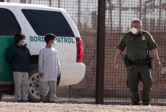 這張2021年3月27日在墨西哥華雷斯拍攝的照片顯示,兩名來自危地馬拉的移民兒童在跨越美墨邊境的里奧格蘭德河后,等待接受美國邊境巡邏隊(duì)人員的處理。新華社發(fā)(戴維·佩納多攝)