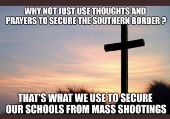 這幅漫畫則諷刺說:“為什么我們不只靠祈禱來阻止非法移民進(jìn)入美國?我們可是只靠祈禱來保護(hù)學(xué)校不發(fā)生大規(guī)模槍擊?!?/p>