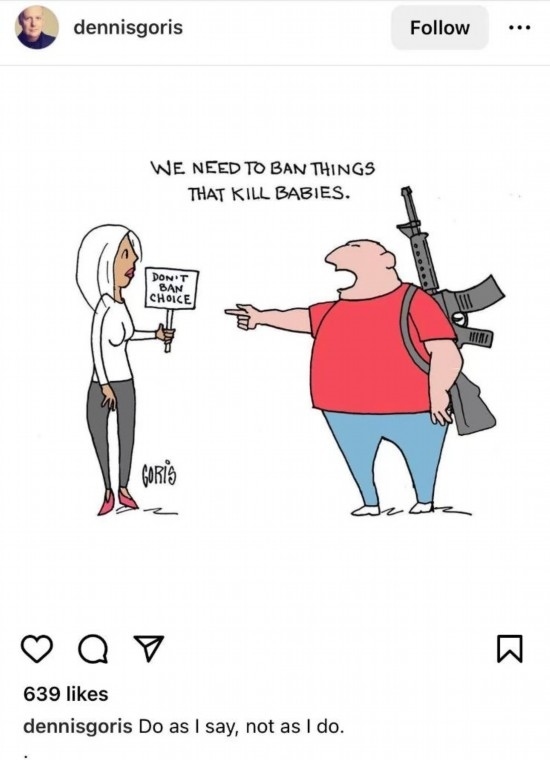 在網(wǎng)友Dennisgoris創(chuàng)作的漫畫中,一名男子指著一名女子說,“我們要禁止殺死嬰兒的政策”,卻無視自己背著的步槍。根據(jù)美國疾控中心等機(jī)構(gòu)數(shù)據(jù),槍支暴力是美國兒童和青少年死亡首要原因。