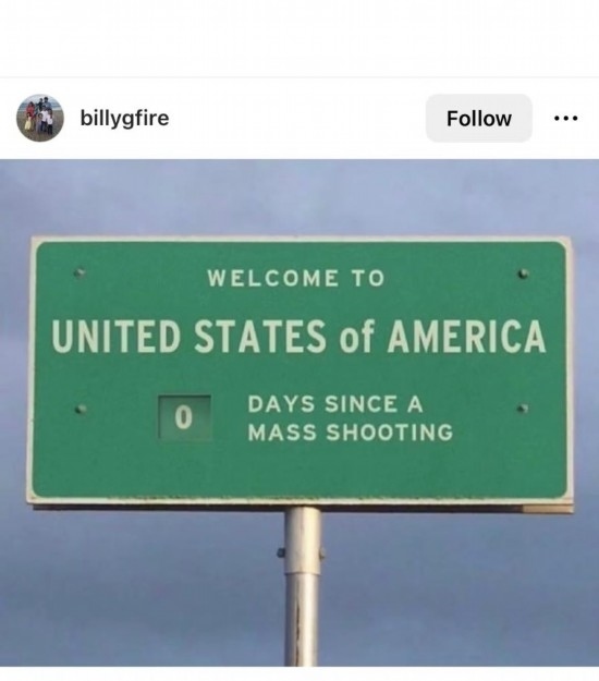 網(wǎng)友Billygfire創(chuàng)作了一塊高速公路廣告牌,上面寫道:“歡迎來到美國,距離上一次大規(guī)模槍擊已經(jīng)過了0天?!?/strong>
