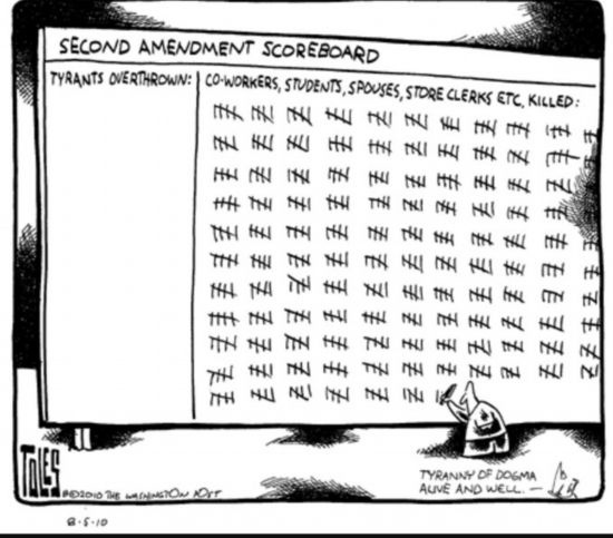 這幅漫畫題為《第二修正案“得分板”》,右邊顯示因?yàn)榈诙拚杆劳龅耐?、學(xué)生、配偶、商店售貨員等各色人等。美國憲法第二修正案是美國公民擁槍的主要法律依據(jù)。