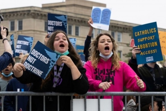2022年5月3日,在美國華盛頓,支持和反對(duì)墮胎權(quán)的人們?cè)诿绹?lián)邦最高法院外集會(huì)。新華社發(fā)(亞倫攝)