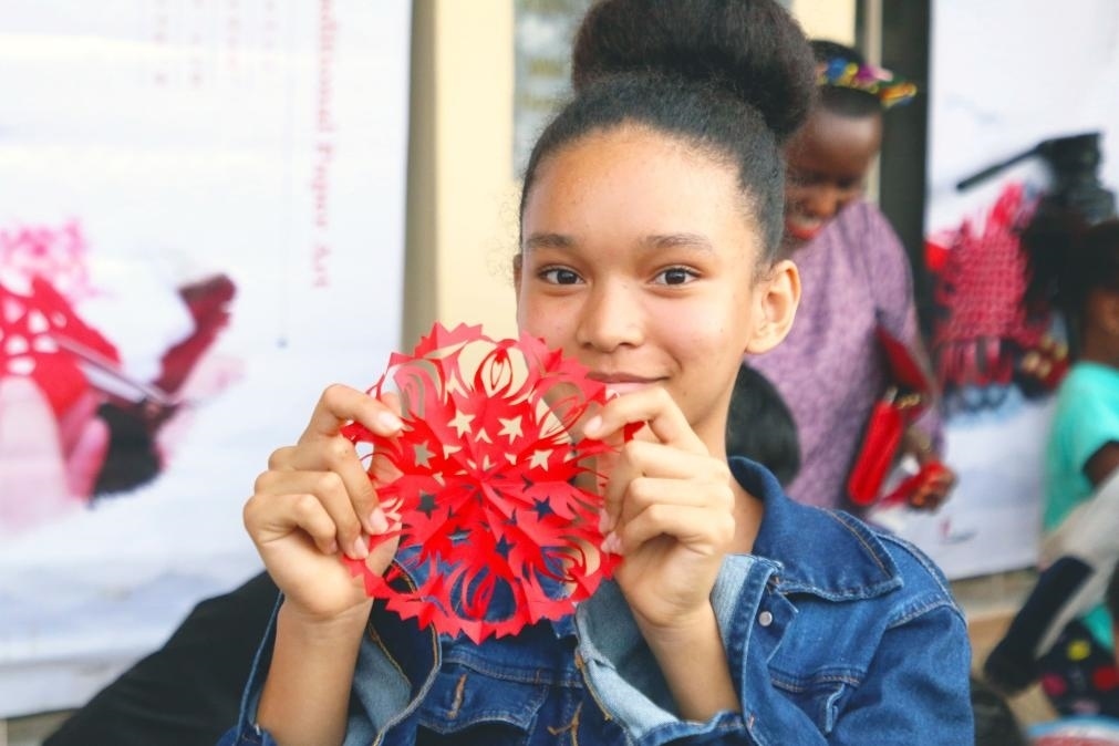 9月23日,盧旺達(dá)首都基加利,在盧旺達(dá)大學(xué)孔子學(xué)院舉辦的“中國(guó)文化進(jìn)校園”暨中秋國(guó)慶慶祝活動(dòng)現(xiàn)場(chǎng),一名女孩展示剪紙成果。(新華社發(fā),黃萬(wàn)晴攝)