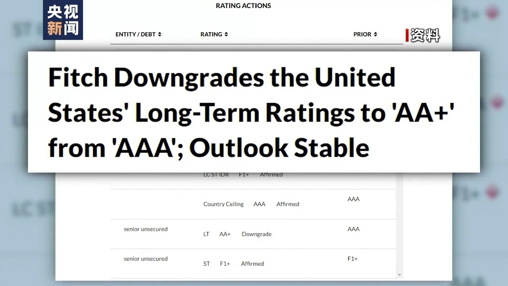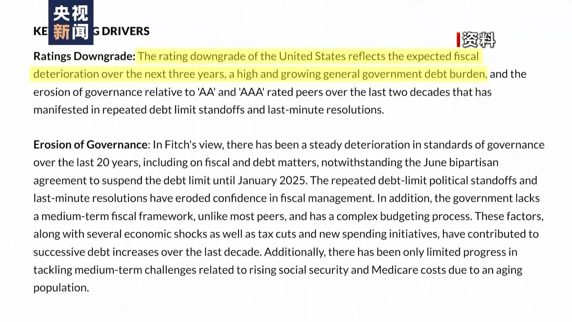 到了2023年8月1日,國際評級機構(gòu)惠譽將美國長期外幣發(fā)行人違約評級從AAA下調(diào)至AA+?;葑u當天發(fā)表聲明說,下調(diào)美國信用評級主要由于美國政府債務(wù)負擔居高不下且不斷加重,未來3年財政狀況預(yù)計將持續(xù)惡化。