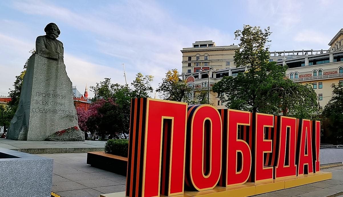 當(dāng)?shù)貢r間5月6日,莫斯科大劇院對面,馬克思雕塑前的“勝利”字樣。鄺西曦 攝