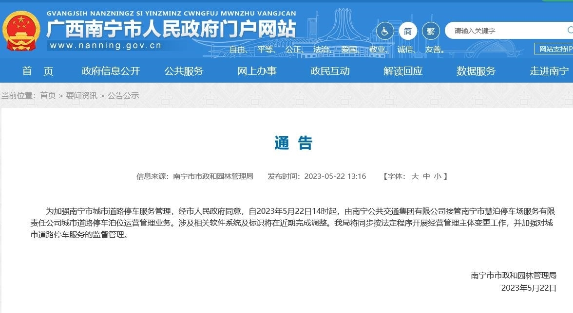 5月22日14時(shí)起 南寧公交集團(tuán)接管慧泊停車運(yùn)營管理業(yè)務(wù) 經(jīng)市人民政府同意,自2023年5月22日14時(shí)起,由南寧公共交......