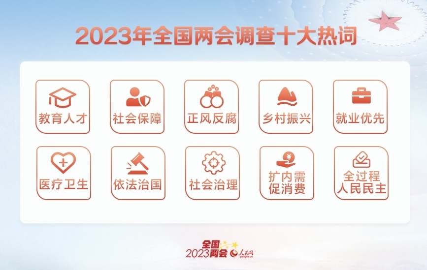 經過網友投票,“教育人才”“社會保障”“正風反腐”“鄉(xiāng)村振興”“就業(yè)優(yōu)先”“醫(yī)療衛(wèi)生”“依法治國”“社會治理”“擴內需促消費”“全過程人民民主”入選十大熱詞。