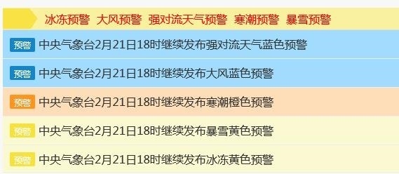 寒潮、暴雪、冰凍、大風(fēng)、強(qiáng)對(duì)流天氣,中央氣象臺(tái)五預(yù)警齊發(fā) 受寒潮影響,預(yù)計(jì),2月21日20時(shí)至23日08時(shí),我國(guó)長(zhǎng)江以南......