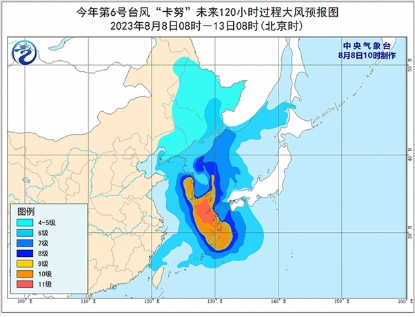 預(yù)計(jì)今年第6號臺風(fēng)“卡努”將以每小時(shí)10公里左右的速度向北移動(dòng),強(qiáng)度將有所增強(qiáng),8月10日上午將在韓國南部沿海登陸,預(yù)計(jì)登陸時(shí)強(qiáng)度為強(qiáng)熱帶風(fēng)暴級或臺風(fēng)級(28~33米/秒,10~12級),11日夜間進(jìn)入我國東北地區(qū)境內(nèi),并逐漸減弱變性為溫帶氣旋。