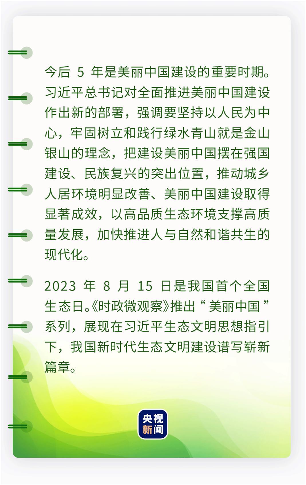 在習(xí)近平生態(tài)文明思想指引下,我們守牢美麗中國建設(shè)安全底線,健全美麗中國建設(shè)保障體系,在神州大地上全面推進(jìn)美麗中國建設(shè),不斷繪出人與自然和諧共生的美好畫卷。