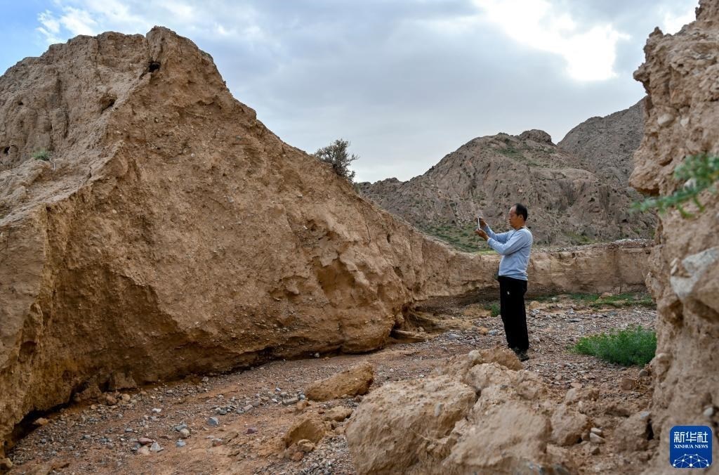 8月20日,董海寧巡查賀蘭山沿線的明長城永寧段時用手機(jī)拍照記錄。新華社記者 連振 攝