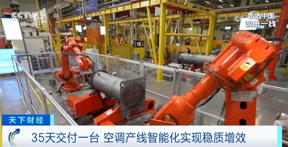 可以看到我身邊這條過道旁擺滿了產(chǎn)品,目前這家工廠所生產(chǎn)的中央空調(diào)處于訂單爆滿的狀態(tài)。生產(chǎn)一臺中央空調(diào)所需要的工序能夠達到上百道,目前這座“燈塔工廠”目前能夠做到最快35天交付產(chǎn)品,這與超級產(chǎn)線背后的智能化改造密不可分??照{(diào)主機下方的大型腔體,它內(nèi)部最多將安裝上千根換熱銅管,這些銅管與腔體之間沒有任何的焊接或黏合,是完全通過膨脹變形來完成固定與密封。這就意味著銅管安裝的好壞直接決定了這臺主機會不會泄漏制冷劑。目前這道工序已經(jīng)交由機械臂來完成,不僅安裝的時間由原來人工的兩個小時縮短至四十五分鐘,而且通過人工智能視覺檢測技術(shù),保障空調(diào)主機零泄漏。