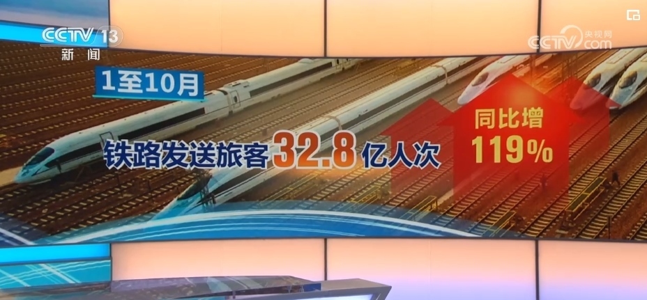 國(guó)鐵集團(tuán)最新數(shù)據(jù)顯示,2023年前10個(gè)月,全國(guó)鐵路發(fā)送旅客32.8億人次,同比增長(zhǎng)119%。其中,9月份,全國(guó)鐵路單日售票量、單日旅客發(fā)送量均創(chuàng)歷史新高。
