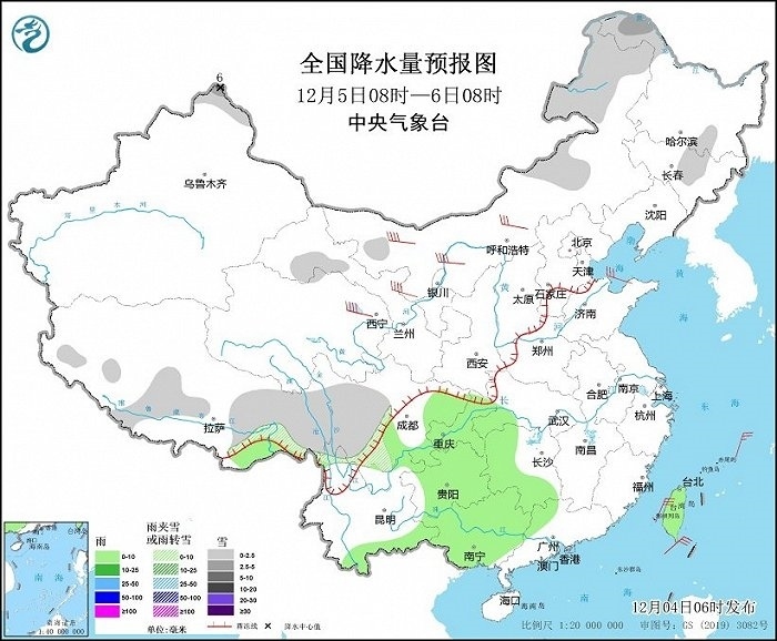 圖1 全國降水量預(yù)報(bào)圖(12月4日08時-5日08時)