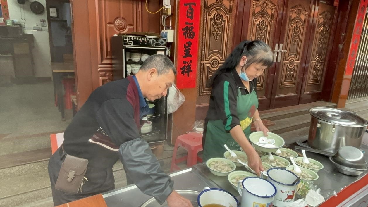 沙縣小吃業(yè)主、手打扁肉技藝傳承人給客人現(xiàn)場制作小吃扁肉。