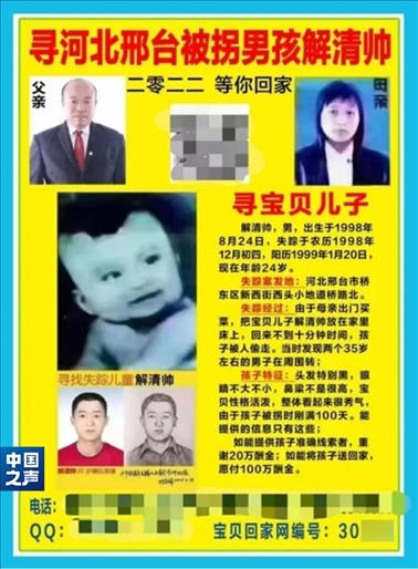 那是尋子25年的第一年。第一時(shí)間報(bào)警、發(fā)動(dòng)親友尋找,能想到的措施,解克鋒都用了。邢臺周邊、北京、河南,騎自行車、摩托車、坐火車,有一絲希望的地方,夫妻倆都去過?!氨M快找到孩子吧,再耽誤下去,孩子長大變了模樣,從眼前走過也認(rèn)不出了”, 這是一個(gè)父親最深的恐懼。