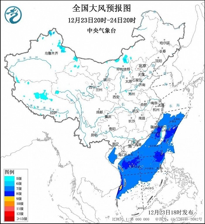 中央氣象臺(tái)12月23日18時(shí)繼續(xù)發(fā)布大風(fēng)藍(lán)色預(yù)警:預(yù)計(jì),12月23日20時(shí)至24日20時(shí),東海南部海域、臺(tái)灣海峽、臺(tái)灣以東洋面、巴士海峽、南海大部海域、北部灣將有7~8級(jí)、陣風(fēng)9~10級(jí)的東北風(fēng),其中南海西南部的部分海域風(fēng)力可達(dá)9級(jí)、陣風(fēng)10級(jí)。
