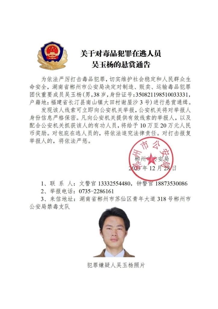 其中,湖南省郴州市公安局決定對張安龍、馬文祥、吳玉楊進(jìn)行公開懸賞通緝;湖南省株洲市公安局決定對楊金梅進(jìn)行公開懸賞通緝;江西省新干縣公安局決定對曾小勇、李國平、孫強(qiáng)進(jìn)行公開懸賞通緝;浙江省溫州市公安局決定對顏歡平進(jìn)行公開懸賞通緝;四川省遂寧市公安局決定對母朝東進(jìn)行公開懸賞通緝;貴州省黔東南州公安局決定對龍華進(jìn)行公開懸賞通緝。