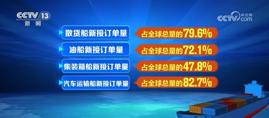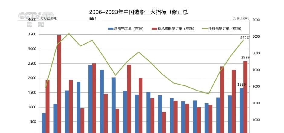 總臺央視記者 吳天白:在2023年中國造船業(yè)統(tǒng)計數(shù)據(jù)中,我們還可以看到三大指標占國際市場份額分別是50.2%、66.6%和55.0%,首次全部超過50%。