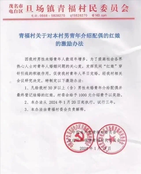 ·廣東茂名一村出臺紅娘獎勵辦法:促成一名男青年結婚獎六百至一千。