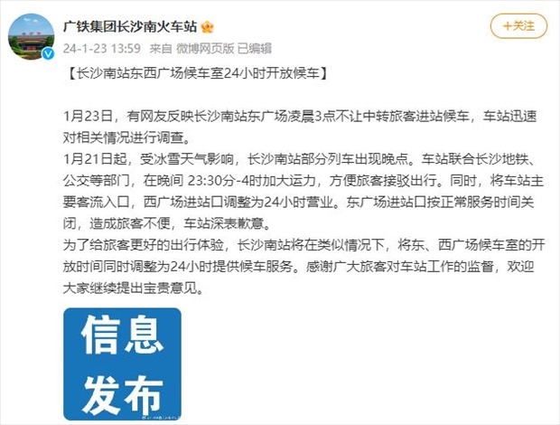 ·凌晨3點不讓中轉旅客進站候車?長沙南站致歉并整改:將車站主要客流入口調整為24小時營業(yè)。