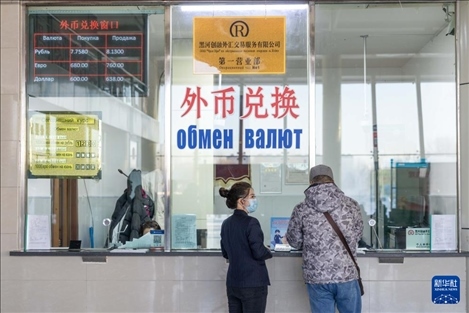 1月30日,在黑河水運(yùn)口岸出境大廳,工作人員幫助游客辦理外幣兌換業(yè)務(wù)。新華社記者 謝劍飛 攝