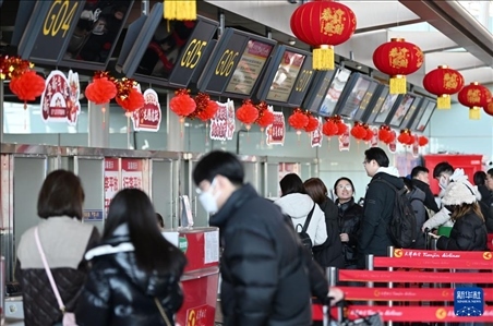 1月26日,旅客在天津?yàn)I海國際機(jī)場排隊(duì)辦理值機(jī)。新華社記者 李然 攝