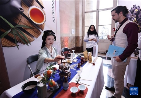 1月30日,在法國巴黎布龍尼亞宮舉行的“你好!中國”旅游推介會(huì)上,嘉賓體驗(yàn)中國茶。新華社記者 高靜 攝
