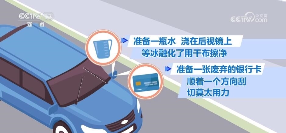 萬(wàn)一后視鏡被凍住怎么辦呢?如果您的車(chē)輛后視鏡具備加熱功能,那這個(gè)問(wèn)題就很容易解決了。但是如果不具備這樣的功能,有兩樣隨手可得的小物件可以幫您輕易解決。一是準(zhǔn)備一瓶水澆在后視鏡上,等冰融化了用干布擦凈;另外可以準(zhǔn)備一張廢棄的銀行卡,順著一個(gè)方向把后視鏡上的冰刮下來(lái)。