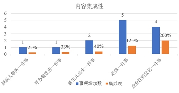 從內(nèi)容集成度看,5項(xiàng)相關(guān)“一件事”的事項(xiàng)集成比例均有不同程度提升?!皻埣踩朔?wù)一件事”增加1個(gè)事項(xiàng),集成度提升25%?!伴_辦餐飲店一件事”增加1個(gè)事項(xiàng),集成度提升33%?!靶律鷥撼錾患隆痹黾?個(gè)事項(xiàng),集成度提升40%。“退休一件事”增加5個(gè)事項(xiàng),集成度提升125%。“企業(yè)注銷登記一件事”增加4個(gè)事項(xiàng),集成度提升200%。