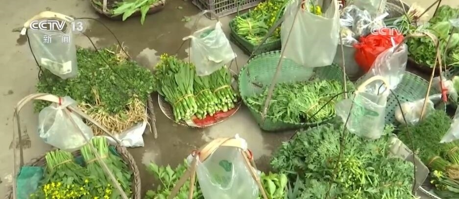 一大早,78歲的李蘭英就開始到地里忙活,澆水、除草、摘菜,手腳十分麻利。摘了兩大籃子的菜,她洗凈扎好,用扁擔(dān)挑起前往路口的超市。這里距離她的菜地只有200米,走路過來也就幾分鐘,超市門口的這片小空地此時(shí)已經(jīng)滿滿當(dāng)當(dāng)擺滿了30來筐的新鮮蔬菜。