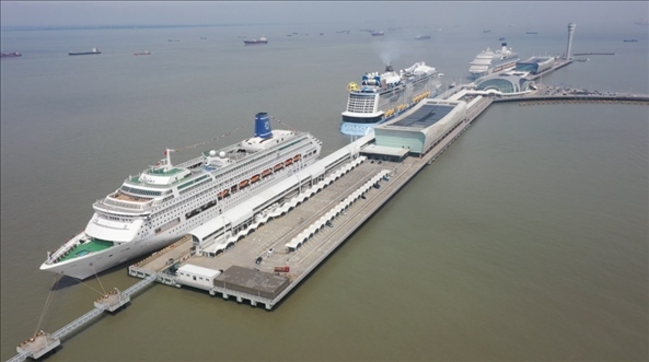 5月22日,“愛(ài)達(dá)·魔都號(hào)”“海洋光譜號(hào)”和“鼓浪嶼號(hào)”三艘郵輪??吭趨卿量趪?guó)際郵輪港(無(wú)人機(jī)照片)。(上海邊檢總站供圖)