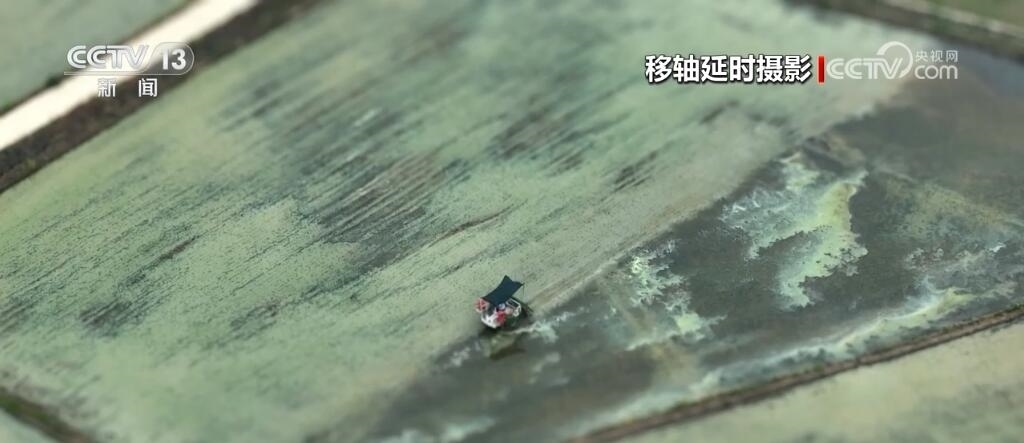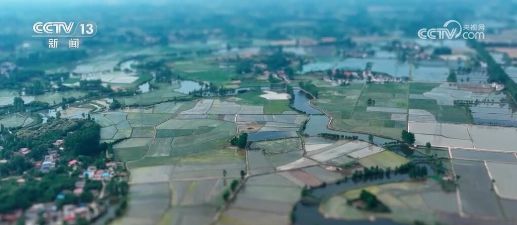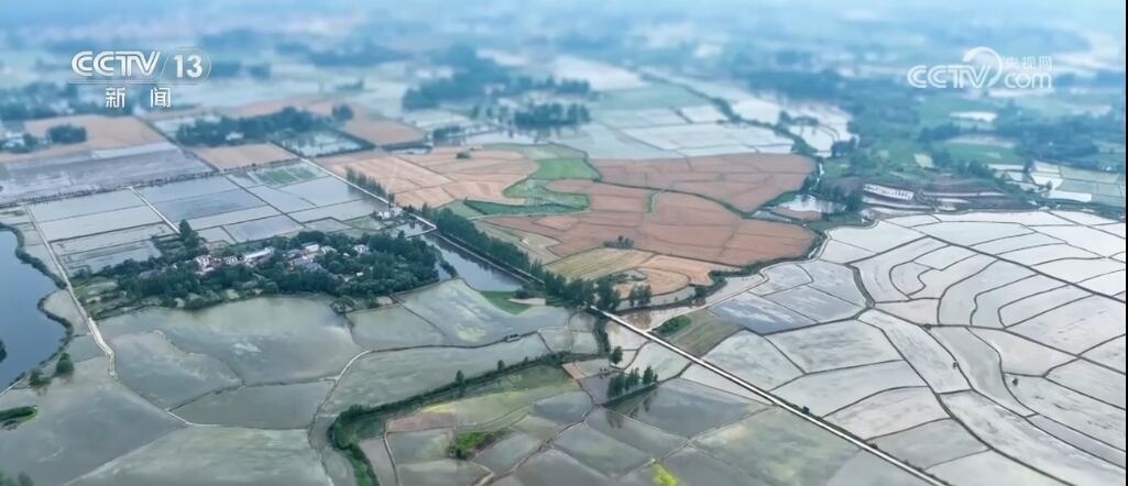 現(xiàn)在您看到的是河南信陽(yáng)淮河以南的水稻插秧現(xiàn)場(chǎng)。插秧機(jī)在田間穿梭,一株株茁壯的秧苗被整齊有序地植入田間,一會(huì)兒工夫就插滿了整塊稻田??罩懈╊慌_(tái)臺(tái)插秧機(jī)在農(nóng)機(jī)手的操控下好似一把把畫(huà)刷,在稻田上輕輕暈染,繪就丹青。而同在信陽(yáng),淮河以北的麥田里,則是金色的麥浪翻滾起伏,收割機(jī)馳騁田間,飽滿的麥穗被卷入機(jī)艙,經(jīng)過(guò)收割、脫粒,顆粒歸倉(cāng)。