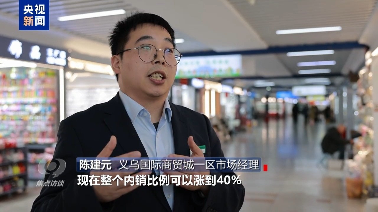 義烏國(guó)際商貿(mào)城一區(qū)市場(chǎng)經(jīng)理 陳建元:我們有一個(gè)統(tǒng)計(jì),拿我們的飾品行業(yè)來說,經(jīng)過這幾年培育,直播電商的快速發(fā)展,有些經(jīng)營(yíng)戶轉(zhuǎn)型,現(xiàn)在整個(gè)內(nèi)銷比例可以漲到40%,比例還是有一個(gè)很明顯的提升。