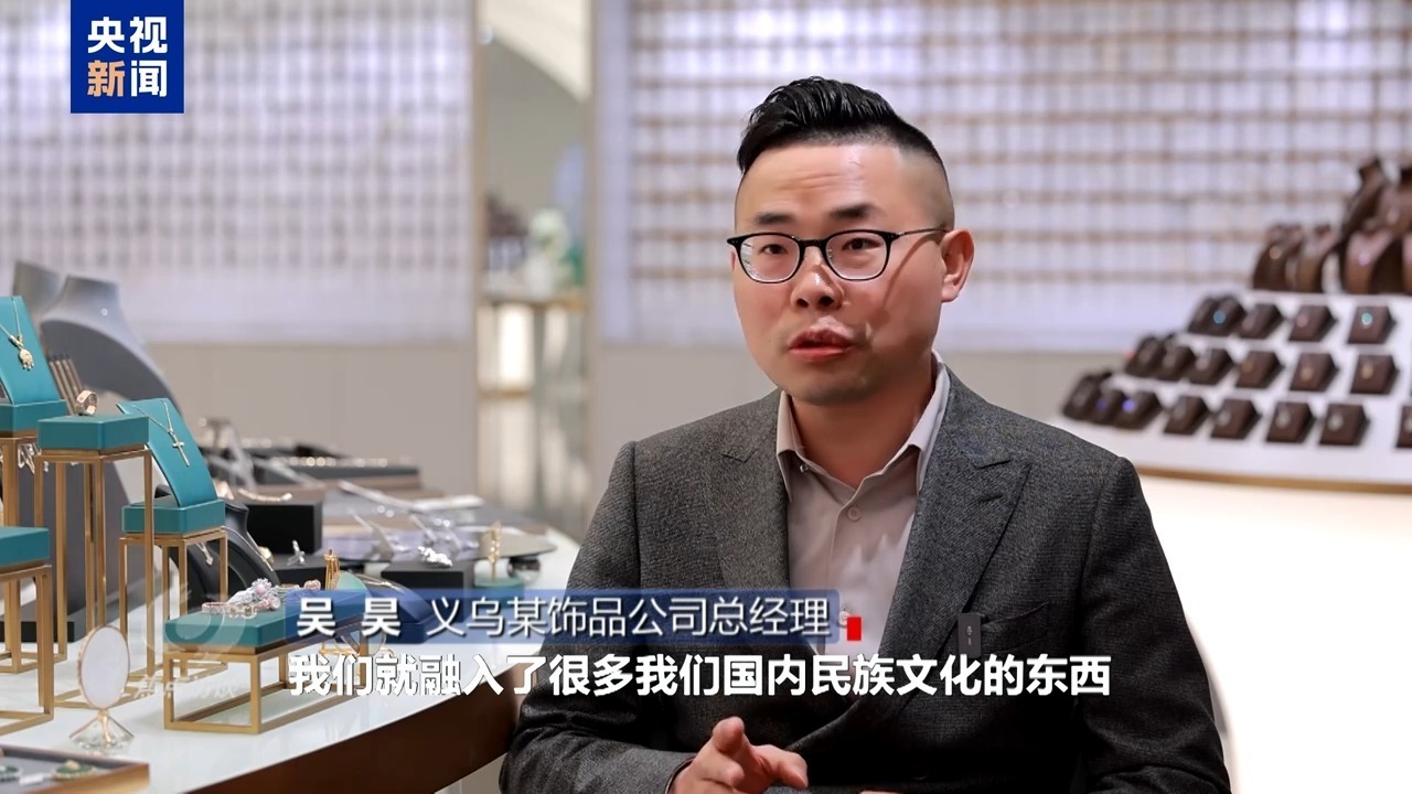 義烏某飾品公司總經(jīng)理 吳昊:在這一塊,融入了很多我們國(guó)內(nèi)民族文化的東西,重新組合去創(chuàng)造,他們都會(huì)喜歡這個(gè)東西。其實(shí)歸根結(jié)底,還是我們通過這么多年的發(fā)展,我們國(guó)家人民的日子越過越好的時(shí)候,這個(gè)民族文化的自信是從國(guó)人的骨子里面迸發(fā)出一種自信的體現(xiàn)。