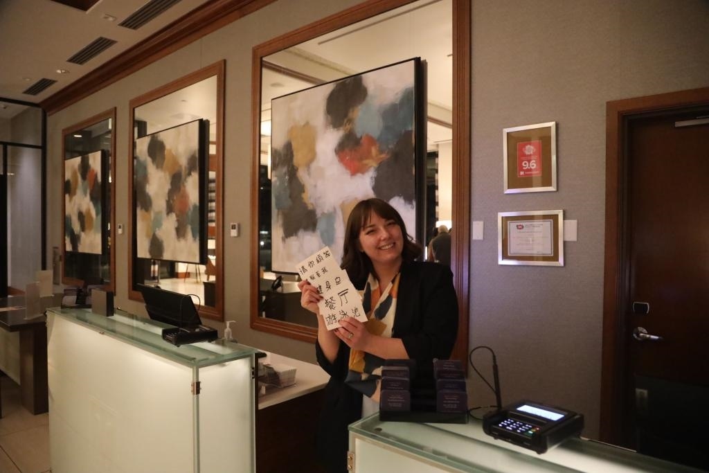 當?shù)貢r間1月28日,馬斯卡廷一家酒店前臺工作人員謝伊·馬丁展示自己為迎接中國學生而手繪的中文指引卡片。新華社記者徐劍梅攝