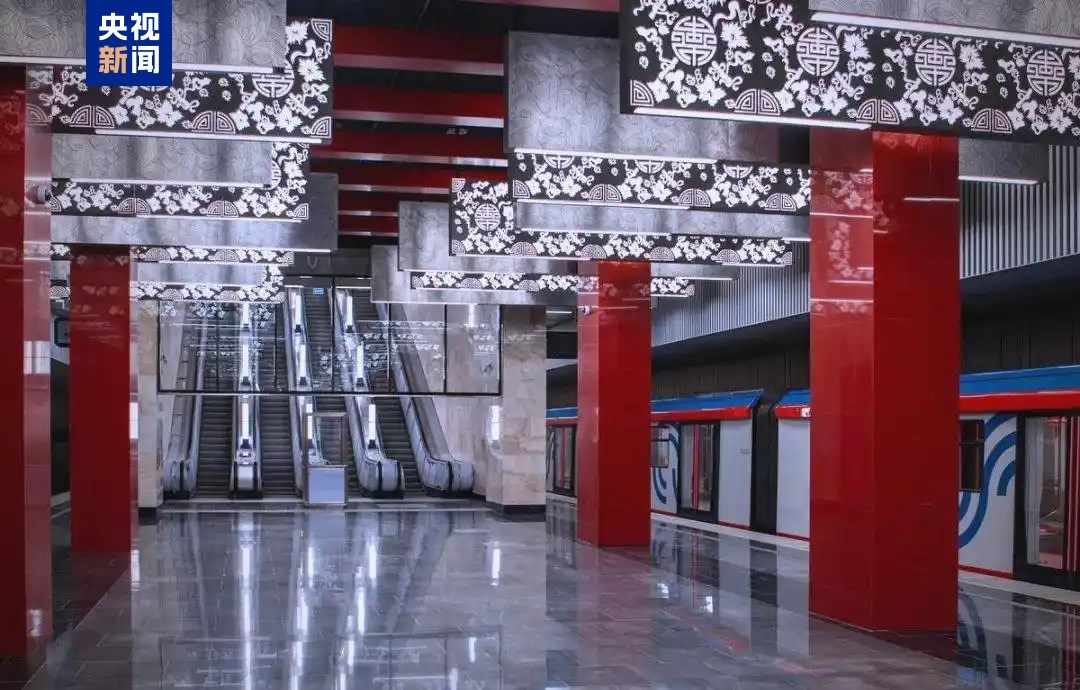 △莫斯科地鐵米丘林大街站由中企中標(biāo)建設(shè),地鐵站有紅色立柱、團(tuán)壽紋、祥云等中國(guó)元素裝飾。