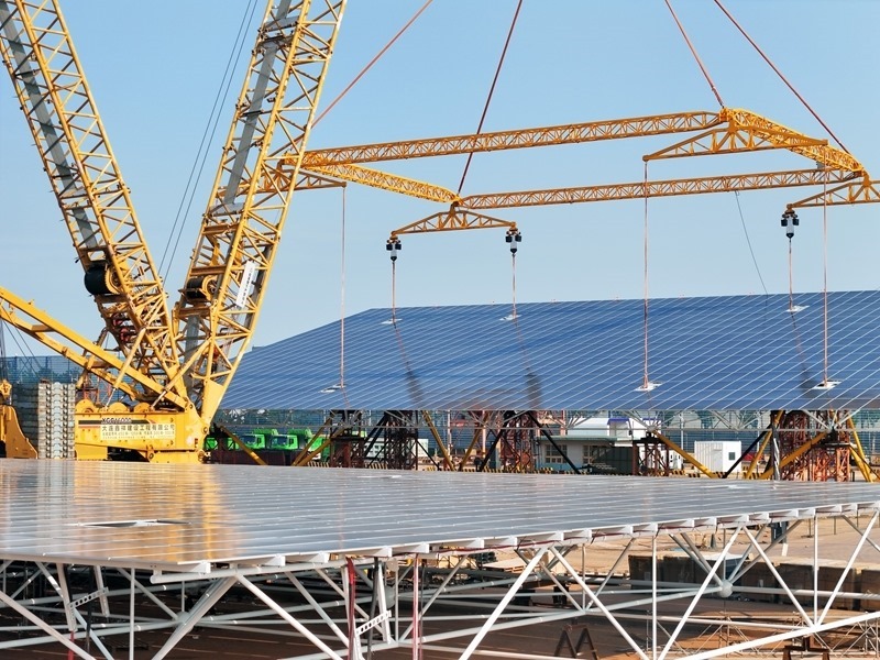 6月16日,在山東港口煙臺港萊州港區(qū),起重機在裝配大型鋼桁架海上光伏平臺(無人機照片)。5月份,全國規(guī)模以上工業(yè)增加值同比增長5.8%。
