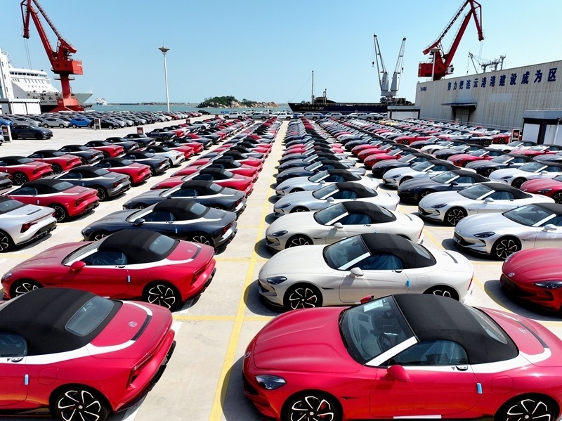 6月16日,在江蘇省連云港港東方港務(wù)分公司碼頭,大批車輛等待裝船外運(無人機照片)。5月份,貨物進出口總額38098億元,同比增長2.7%。