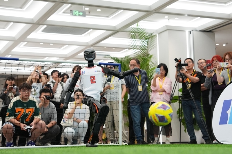 6月17日,加速進化Booster T1機器人在北京經(jīng)開區(qū)的機器人大世界展示“大力射門”。
