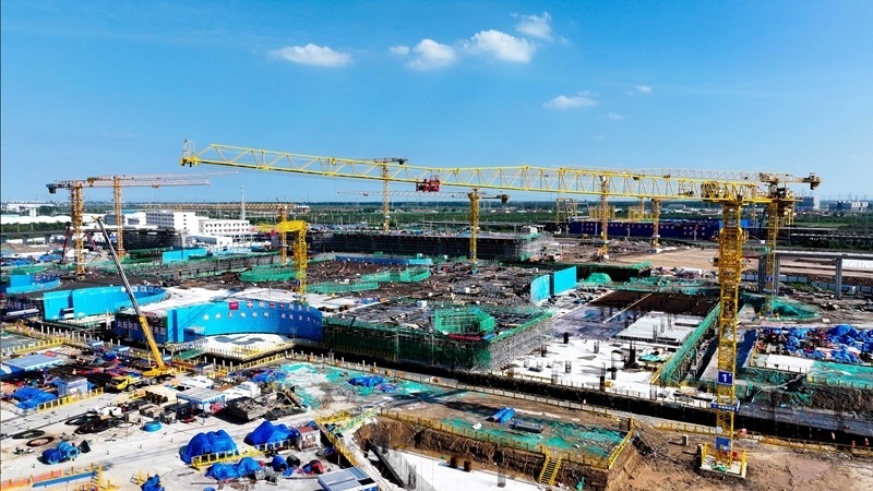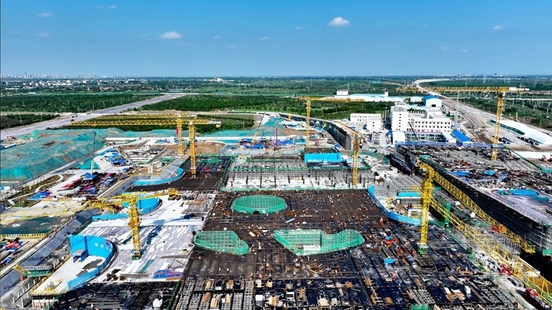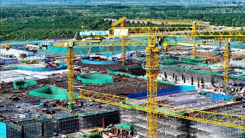 7月25日,在津?yàn)H高鐵山東東營高鐵站現(xiàn)代綜合客運(yùn)樞紐及配套工程建設(shè)現(xiàn)場,中鐵二十局工作人員在施工(無人機(jī)照片)。