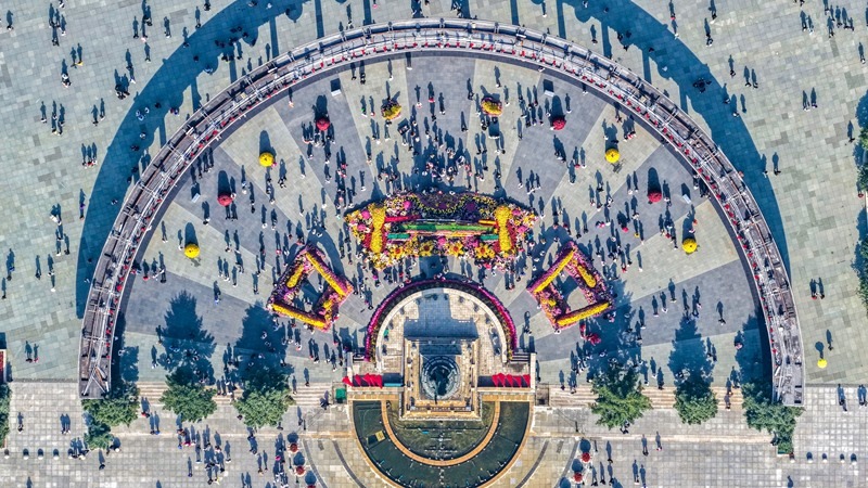 10月2日,游客在黑龍江省哈爾濱市防洪勝利紀念塔廣場游玩(無人機照片)。
