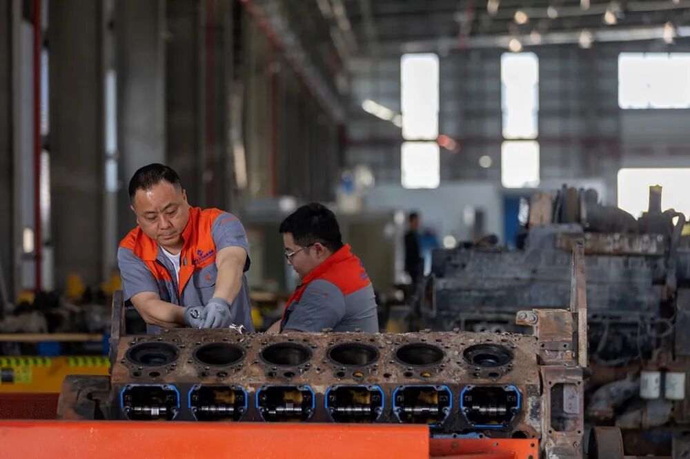 1月13日,中車國際車輛產(chǎn)業(yè)(海南)有限公司維修師在工廠維修發(fā)動機(jī)。(中國外文局歐亞中心記者段崴 攝)