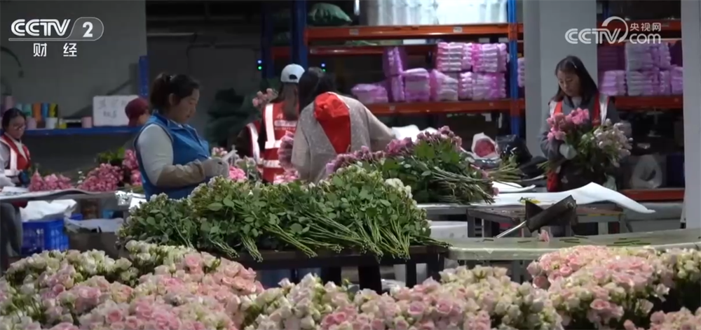 商家介紹,本月出口鮮花的發(fā)貨量是日常的五倍,目前訂單已經(jīng)排到年后。新鮮采摘的鮮花在出口商車間完成分揀、包裝、保鮮等處理后,由冷鏈送往機(jī)場過關(guān)出口,整個(gè)流程最快不到20小時(shí)就能完成。
