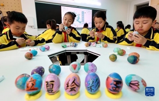 5月5日,在山東省棗莊市東湖小學,學生們在繪制彩蛋。