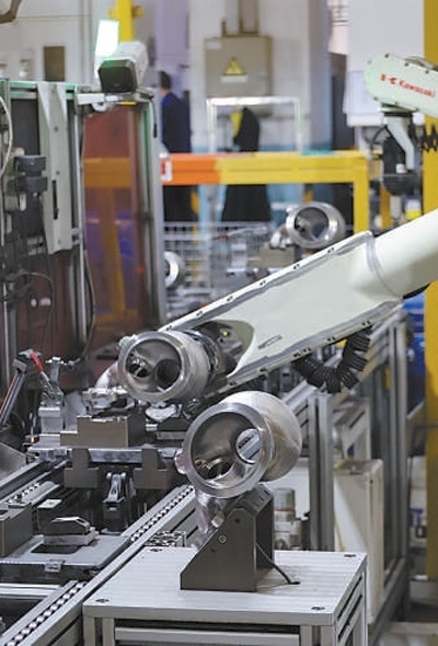 江蘇無錫職業(yè)技術(shù)學(xué)院教師團(tuán)隊(duì)為蠡湖增壓技術(shù)公司研發(fā)的殼體機(jī)器人自動化去毛刺工作站正在作業(yè)。無錫職業(yè)技術(shù)學(xué)院黨委宣傳部供圖